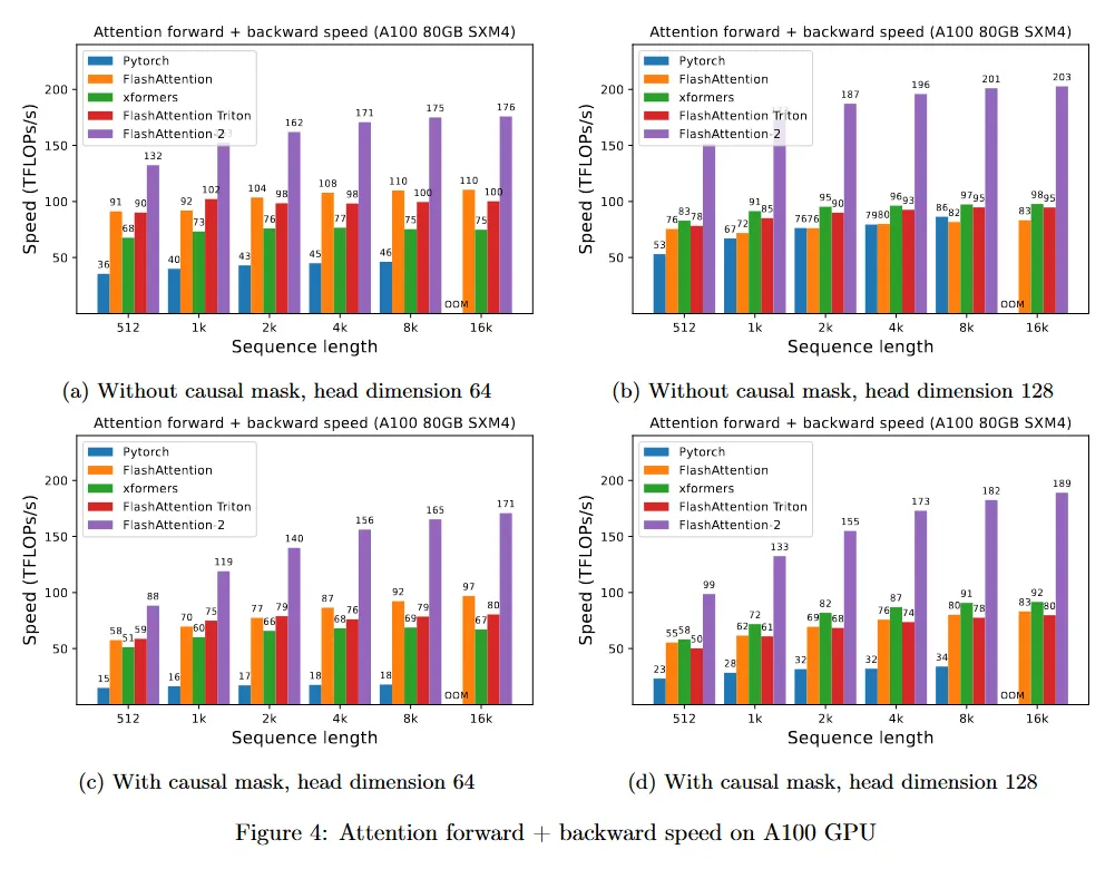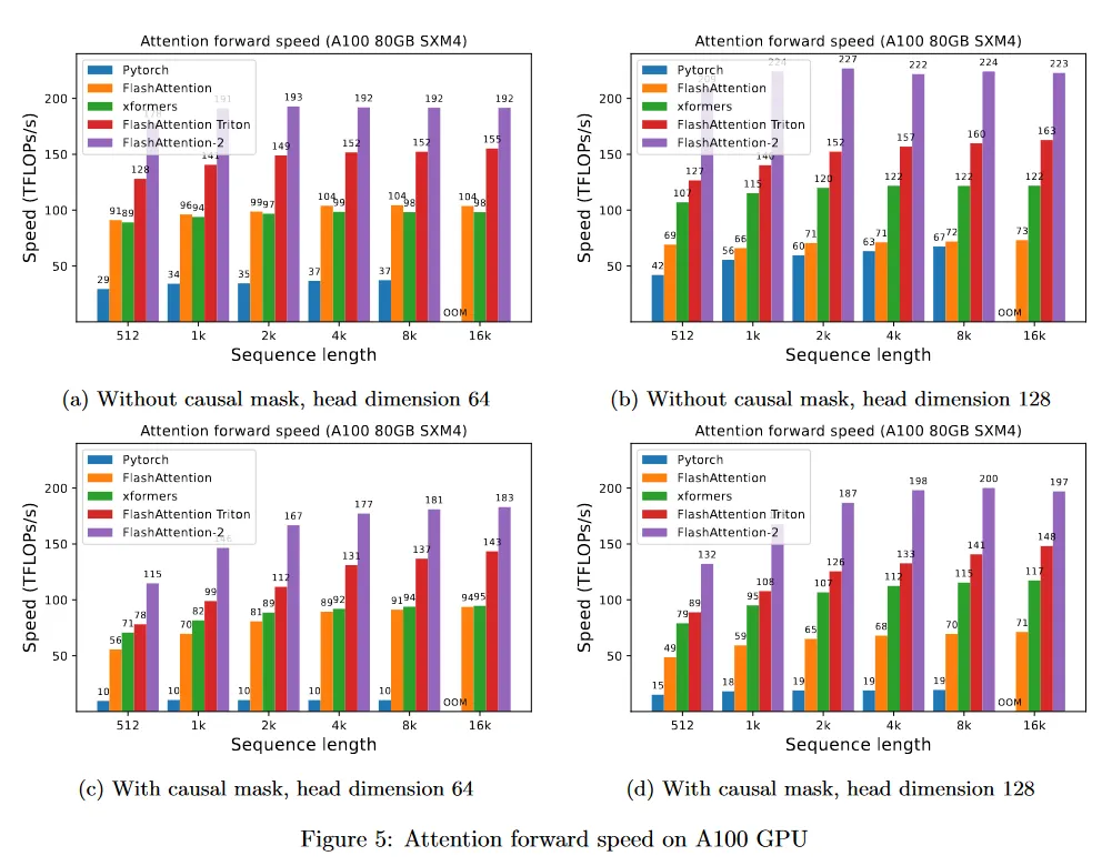 섹션 4에서 FLashAttention-2가 FlashAttention과 비교하여 큰 속도 개선을 산출한다는 것을 경험적으로 평가한다. 다양한 설정(causal mask를 사용하거나 사용하지 않거나, 다양한 head 차원)에 대한 벤치마크에서 FlashAttention-2가 FlashAttention에 대해 2배 이상 빠르다는 것과 forward pass에서 이론적 최대 처리량의 73%, backward pass에서 이론적 최대 처리량의 63%에 도달하는 것을 보인다. GPT-style 모델을 학습하기 위해 end-to-end를 사용할 때 A100 GPU당 최대 225 TFLOPs/s의 학습 속도에 도달한다.
