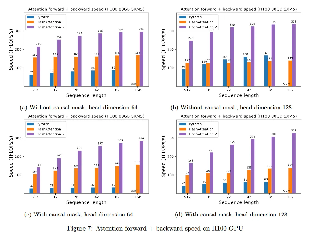 H100 GPU에서 동일한 구현을 실행하면(TMA와 4세대 Tensor Core 같은 새로운 feature의 사용하기 위한 특별한 명령어를 사용하지 않고) 최대 335 TFLOPs/s을 얻었다(그림 7). 우리는 새로운 명령어를 사용하면 H100 GPU에서 1.5-2배 더 빠를 수 있을 것으로 기대한다. 이 작업은 미래를 위해 둔다.