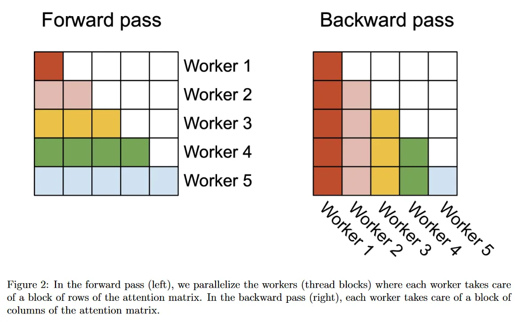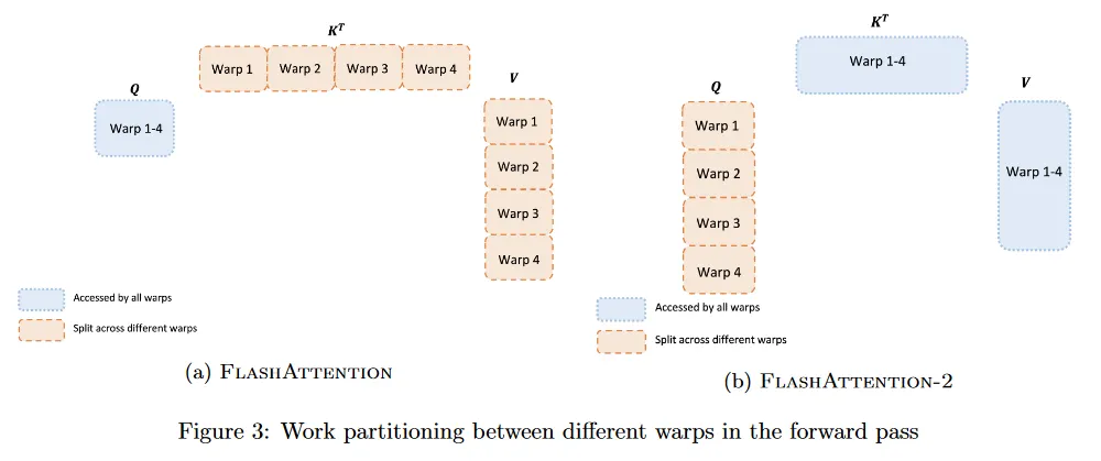 FlashAttention-2에서 대신 를 4개 warps으로 분할하면서 와 를 모든 warps에서 접근가능하게 한다. 각 wrap가 행렬 곱을 수행하여 의 조각을 얻은 후, 공유된 의 조각과 곱하면 해당 출력 조각을 얻을 수 있고, wraps 사이의 통신이 필요하지 않다. shared 메모리에서의 읽기/쓰기가 축소되면 속도 개선을 얻는다(섹션 4).
