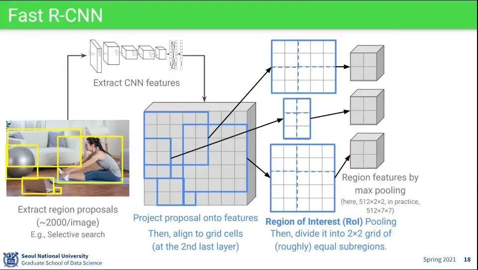 이때 전체 이미지에 대해 Conv feature는 1번만 뽑음 —모든 이미지에 대해 뽑았던 R-CNN과 달리