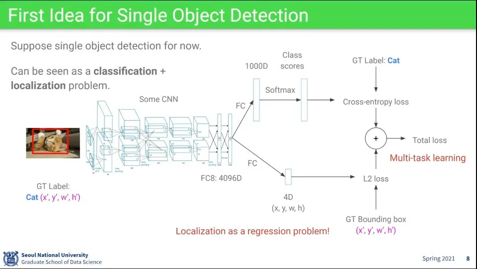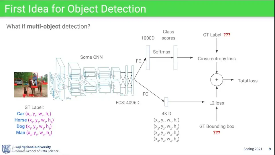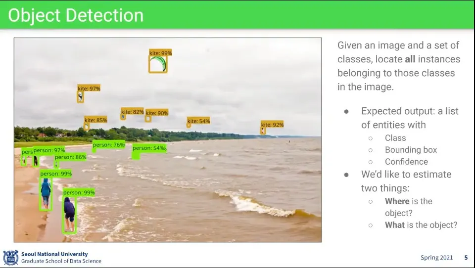 Object Detection은 이미지에 여러 class의 object가 있고, 그게 각각 어디에 있는지를 맞추는 것