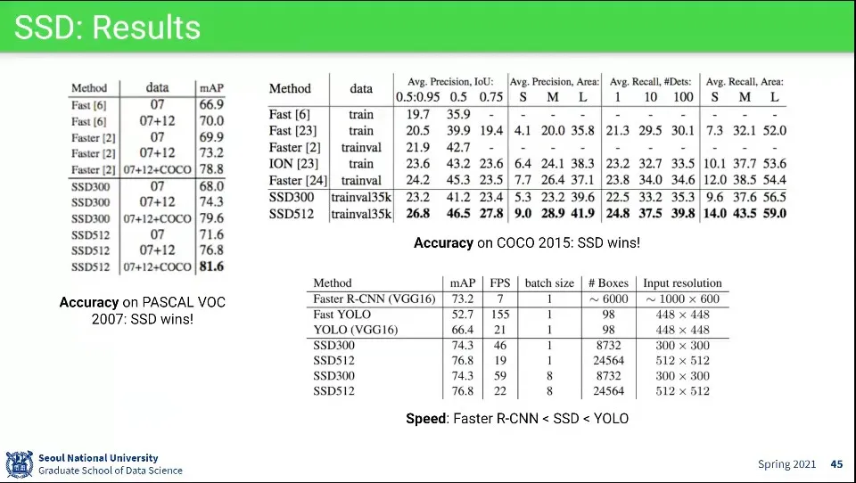 SSD는 Faster R-CNN보다 정확도가 높음. 대신 YOLO 보다 느림