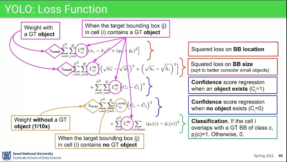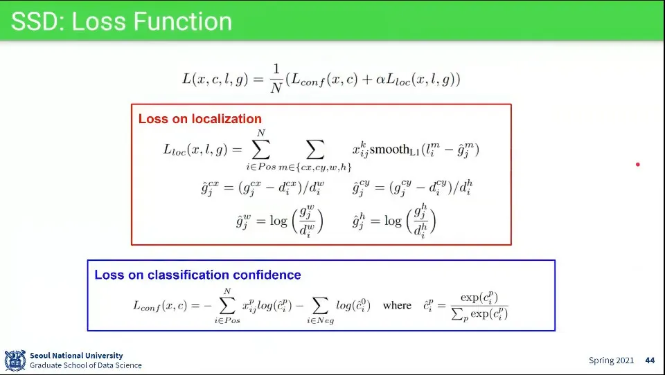 YOLO와 마찬가지로 location과 classfication을 하나의 loss 함수에 넣음. 각 loss의 상세 내용은 그 아래 나옴.