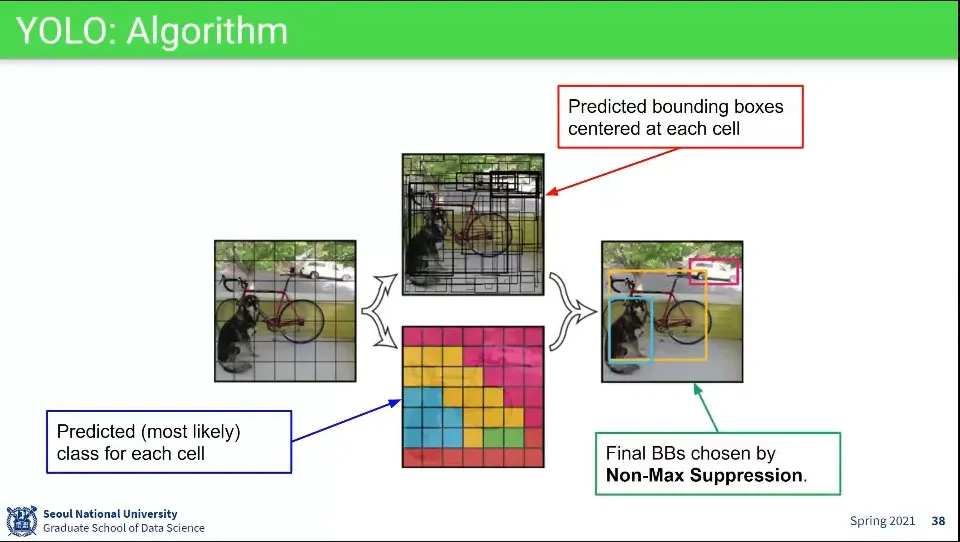각 칸이 어떤 클래스에 들어가는지 예측함 (가운데 아래 그림)