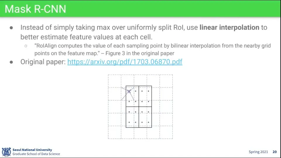 bounding box의 크기가 pooling 하기 적절하지 않은 크기일 수 있으므로 적당히 사이즈를 잘라서 pooling 한다. 위 이미지에서는 2x2로 만들기 위해 이미지를 적절하게 4등분함