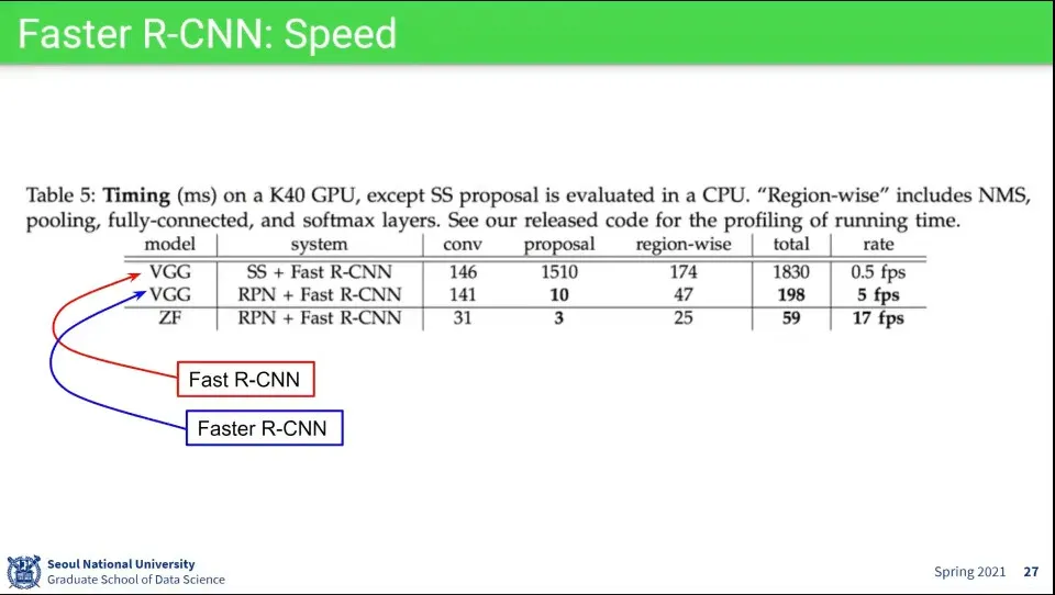 Fast R-CNN보다 Faster R-CNN에서 proposal 단계 속도가 150배 빨라짐. 전체에 대해 10배 빨라졌다고 함