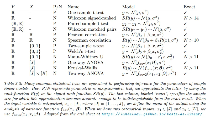 다행히 가장 일반적인 테스트 중 상당수가 일반화 선형 모델이나 GLM(Gaussian Linear Model)의 파라미터 추론으로 표현될 수 있다. 아래 표 참조.