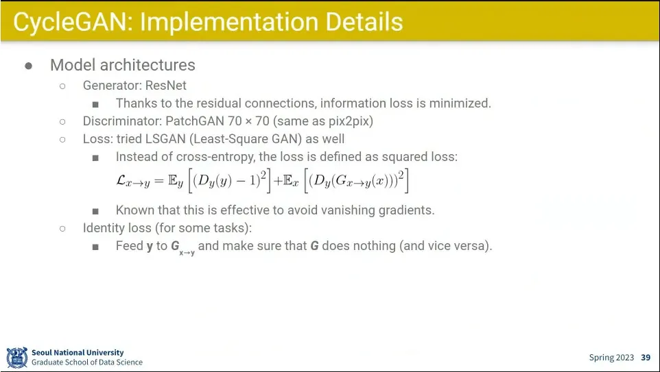 Generator는 ResNet을 쓰고 Discriminator는 PatchGAN을 씀.
