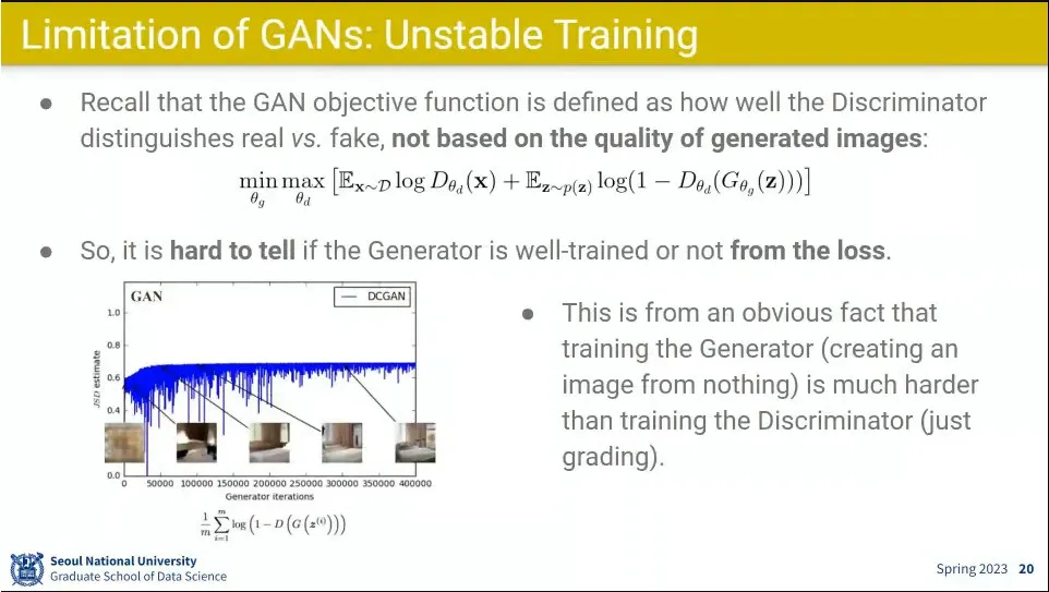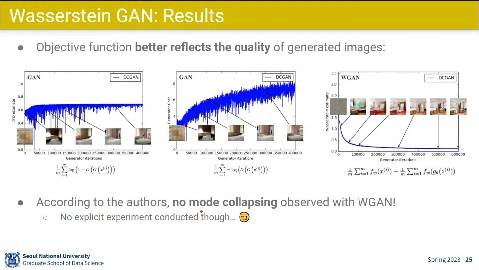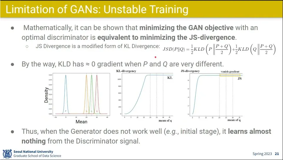 그래서 KLD, JSD를 minimize하는게 학습에 별 도움이 안 됨. 초반에는 두 분포의 거리가 매우 크므로.