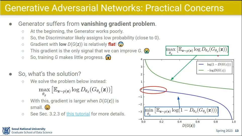 이 문제를 해결하기 위해 처음에는 loss를 바꿔서 maximize 하는 식을 사용 함. 이러면 초반에 기울기가 급격해서 학습이 잘 됨.
