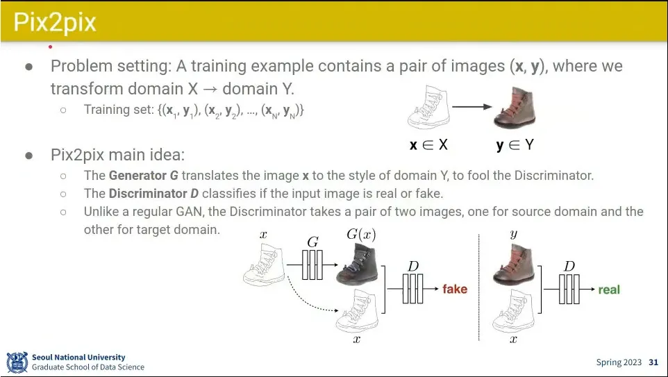 추가로 마지막 텀으로 생성한 이미지가 실제 domain pair가 맞도록 하는 loss를 받아서 style에 맞는 이미지를 생성하도록 함. ← 이 텀이 없으면 아무 신발이나 그려내게 됨.