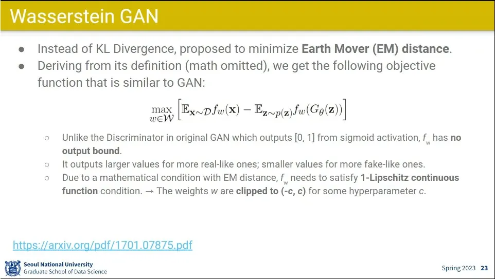 Wasserstein GAN은 KL Divergence를 안 쓰고 Earth Mover(EM) distance를 쓰게 함.