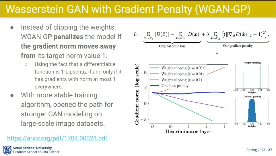 WGAN-GP는 WGAN을 개선해서 넘어야 하지 않을 값 사람이 c로 정해주지 않고, loss 함수에 regularization으로 동작하는 penalty 텀을 줘서, 대신 그걸 조절해 주는 하이퍼파라미터 를 줌.
