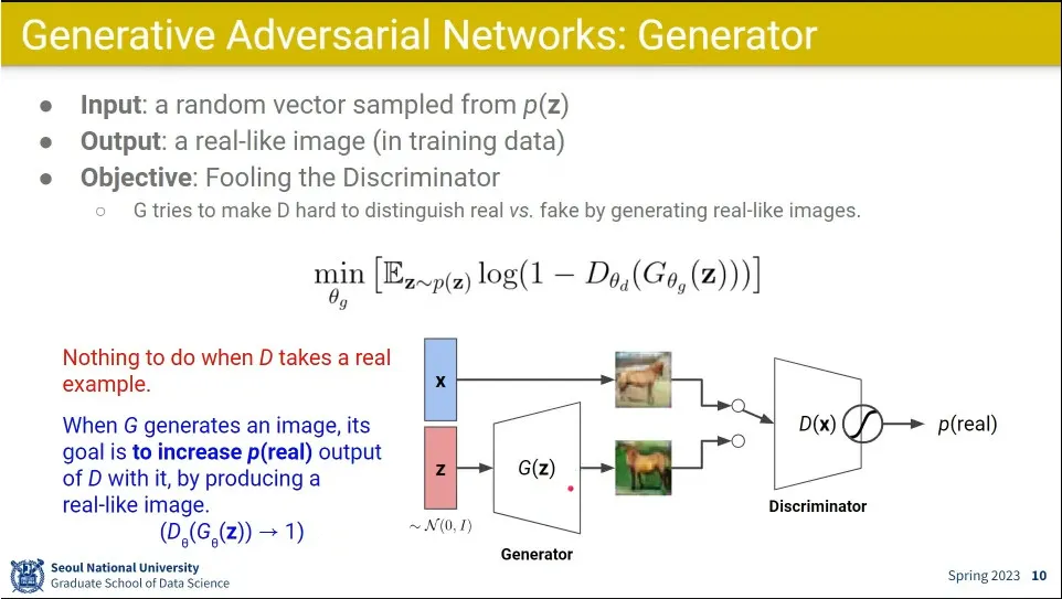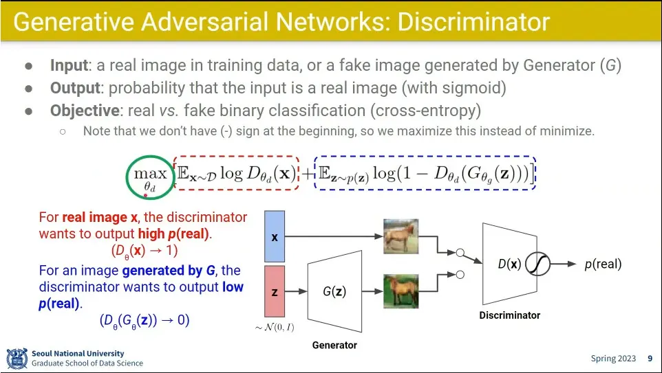 앞 텀은 진짜 이미지를 맞췄을 때 1이 나오고, 뒤쪽 텀은 가짜 이미지를 맞췄을 때 1이 나오게 해서 전체 합을 maximize 함.