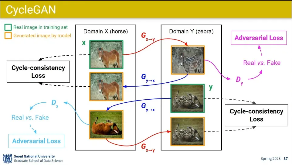 pair 이미지 없이, 특정 domain으로 style을 바꿨다가, 다시 원래 이미지로 돌아오게 해서 원래와 같은 이미지를 만드는게 아이디어.