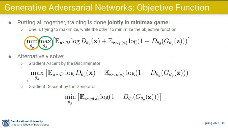 Discriminator 입장에서는 loss를 maximize 해야 하기 때문에 Gradient Ascent 하고, Generator 입장에서는 loss를 minimize 해야 하기 때 문에 Gradient Descent 함.