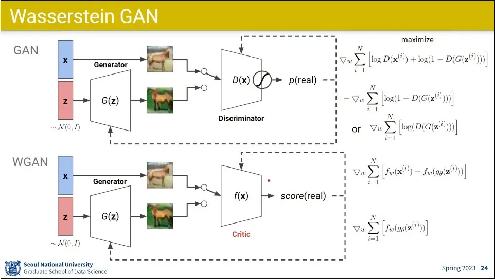 WGAN은 기존 GAN에 대해 Discriminator을 Critic으로 바꿈. 확률이 아니기 때문에.