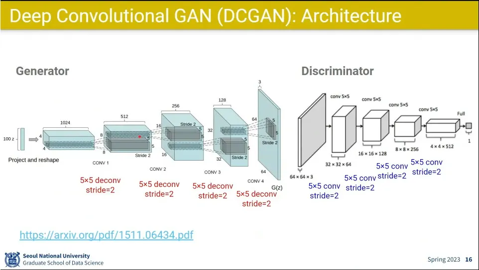 처음 GAN에서는 Generator와 Discriminator를 Fully-connected로 만들었음. 그 다음에 conv, deconv 사용함.