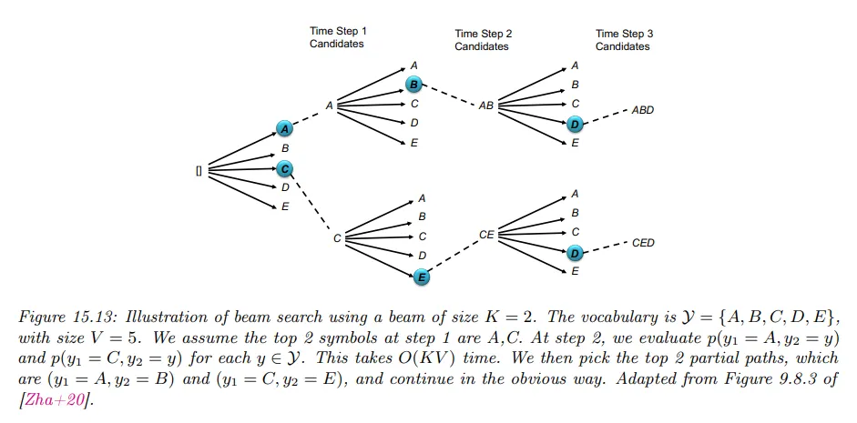 그러나 greedy deconding은 로 정의되는 MAP 시퀀스를 생성할 수 없다. 각 단계 에서 지역 최적 심볼이 전역 최적 경로가 아닐 수 있기 때문이다.