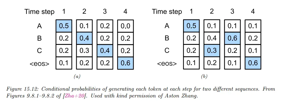 b를 고려하자. 단계 에서 2번째로 가장 가능한 토큰을 고르면 가 된다. 이것을 조건화으로 을 가정하여 MAP 심볼을 greedily 고르면 가 된다. 이것을 조건화으로 을 가정하고 MAP 심볼을 greedily 고르면 eos(end of sentence)가 나오고 생성은 멈춘다. 생성된 시퀀스의 전체 확률은 이다. 따라서 덜 greedy 한 것이 전체 대해 더 높은 likelihood를 갖는 시퀀스를 찾게 한다.