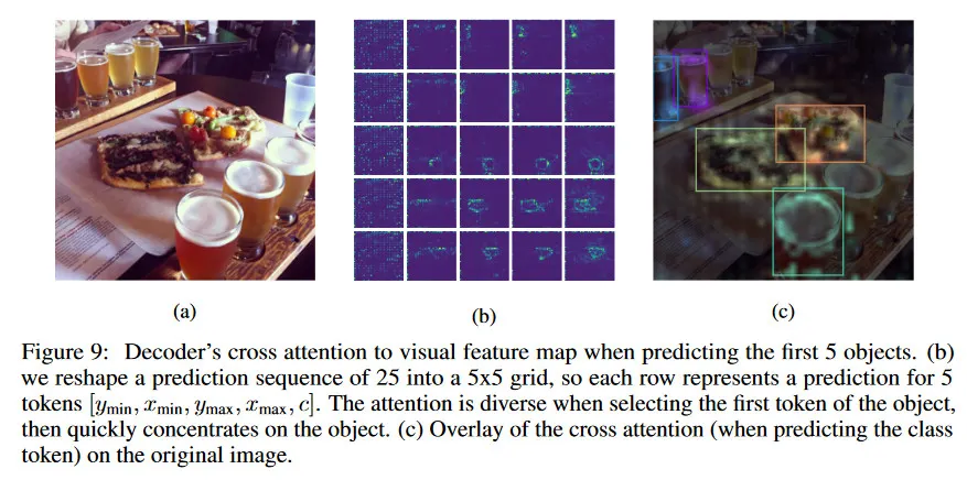 새로운 토큰을 생성할 때, transformer decoder는 이전 토큰에 대해 self attention을 사용하고 인코딩된 visual feature map에 대해 cross attention을 수행한다. 여기서 우리는 모델이 새로운 토큰을 예측할 때, cross attention을 시각화한다(레이어와 head에 걸쳐 평균화 됨). 그림 9는 처음 몇 개의 토큰이 생성될 때의 cross attention map을 보인다. 첫 번째 좌표 토큰(즉 )을 예측할 때 attention이 매우 발산하는 것을 볼 수 있지만, 이후에 빠르게 집중되어 object에 고정되는 것을 볼 수 있다.