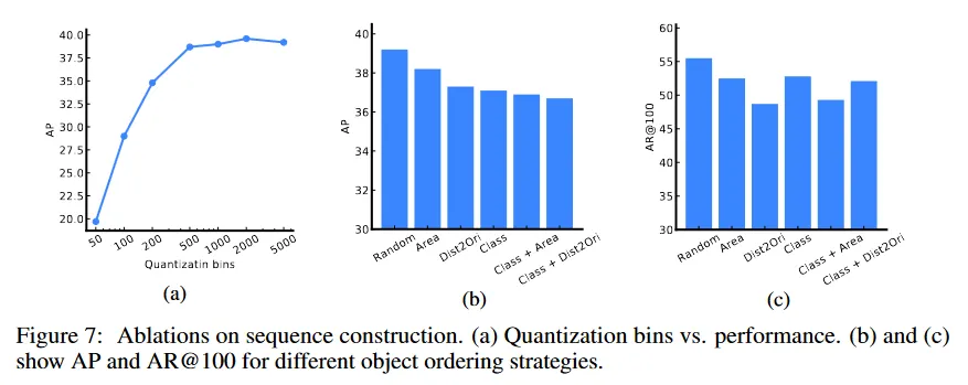 우리는 또한 학습하는 동안 시퀀스 구축에서 다양한 object ordering 전략도 고려한다. 이것에는 1) random 2) area(즉, descending object size), 3) dist2ori(즉, bounding box의 top-left 코너에서 origin까지 거리), 4) class(name), 5) class + area (즉, 객체가 클래스에 의해 우선 정렬된 다음 동일 클래스내에 multiple object가 존재하면 area로 정렬), 6) class+dis2ori를 포함한다. 그림 7b는 average precision(AP)를, 그림 7c는 average recall(AR)을 top-100 prediction에서 보인다. precision과 recall 모두에서 무작위 ordering이 최고의 성능을 산출한다. 우리는 결정론적 ordering을 사용하는 것이 모델이 초기 단계에서 missing object의 실수를 복구하는데 어려울 수 있지만, 무작위 ordering은 나중에라도 이를 검색할 가능성이 있다고 어림짐작한다.