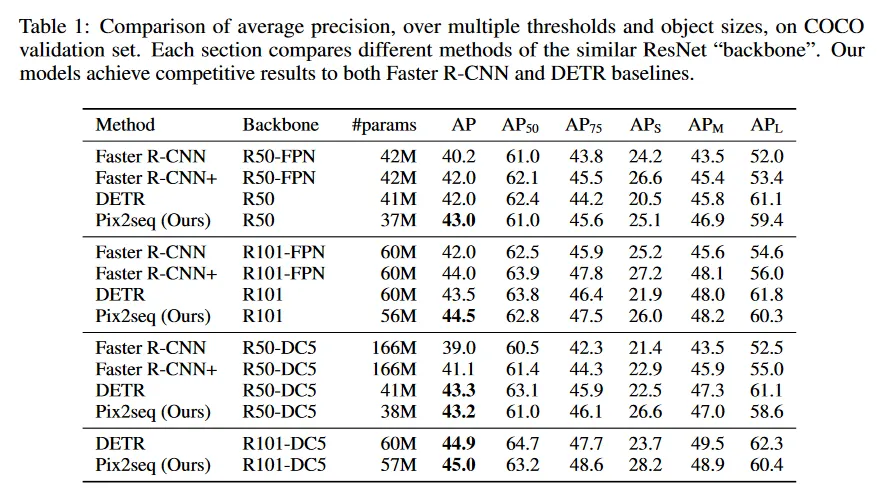 결과는 Table 1 참조. 여기서 각 섹션은 동일한 ResNet ‘backbone’을 서로 다른 방법과 비교한다. 전체적으로 Pix2Seq는 두 baseline과 경쟁력 있는 결과를 달성한다. 우리의 모델은 small과 medium object에서 Faster R-CNN과 비교할 만하고 더 large object에서는 더 잘 수행한다. DETR과 비교하여 우리의 모델은 large와 medium object에서 약간 나쁘지만 small object에서는 더 뛰어나다(4-5 AP 향상)