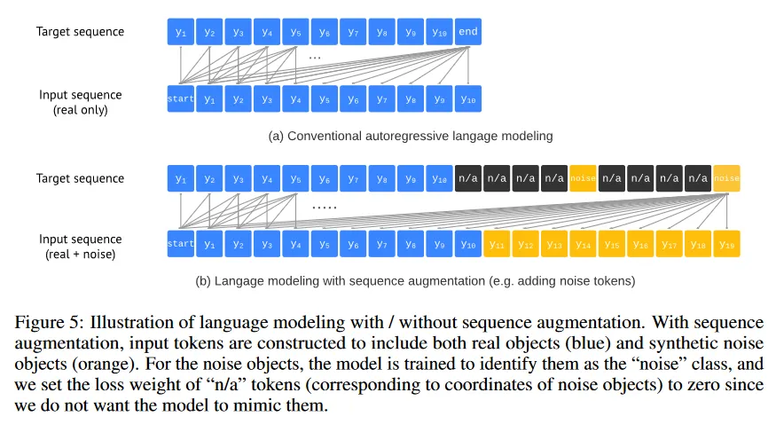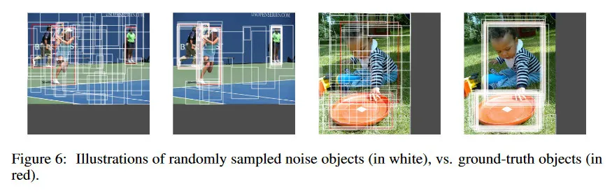 우리는 다음 두 가지 방법으로 입력 시퀀스를 증강하여 synthetic noise object를 생성한다. 1) 기존 ground-truth object에 노이즈를 추가(예: bounding box를 random scaling 하거나 shifting) 2) 무작위로 연관된 클래스 라벨로 완전히 무작위 박스를 생성. noise object의 일부는 어떤 ground-truth object의 동일하거나 겹쳐질 수 있으며 이는 노이즈와 중복된 예측을 시뮬레이션한다. 그림 6 참조. noise object가 합성되고 이산화된 후에 이를 원래의 입력 시퀀스의 끝에 추가한다. 타겟 시퀀스의 경우 noise object의 타겟 토큰을 ‘noise’ 클래스로 설정하고(어떤 ground-truth class label의 임의의 것에 속하지 않는), 좌표 토큰을 “n/a”로 설정하여 loss 가중치를 0으로 만든다. 즉 방정식 1에서 로 설정한다.