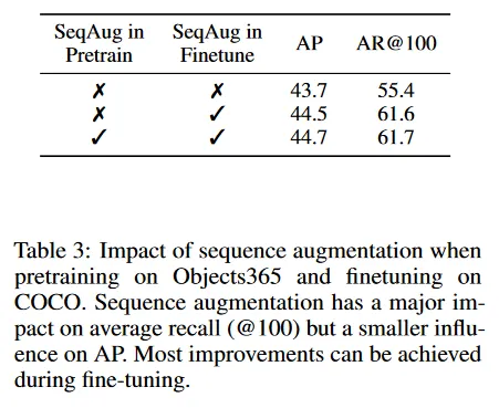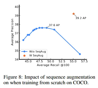 여기서 우리는 시퀀스 증강(즉, noise object 추가)이 두 가지 모델 학습 전략에 미치는 영향을 연구한다. 1) COCO에서 시작부터 학습 2) Object 365에서 pre-training 후에 COCO에서 fine-tuning. 시퀀스 증강을 사용한 경우와 사용하지 않은 경우의 처음부터 학습하는 결과는 그림 8에 보여진다. 시퀀스 증강 없이 추론 하는 동안 EOS 토큰의 샘플링을 지연시키면(likelihood offsetting을 통해) AP가 약간 나빠지지만, 최적의 AP에서 recall이 매우 나빠지는 것을 발견했다. Table 3은 pre-training + fine-tuning 설정에 대한 유사한 결과를 보인다(여기서는 ending token에 대해 likelihood offset을 조정하는 대신 loss 가중치를 0.1로 설정한다). AP에는 큰 영향이 없지만 시퀀스 증강이 없으면 recall이 매우 나쁘다는 것을 발견했다. 또한 시퀀스 증강이 주로 fine-tuning 하는 동안 효과를 갖는다는 점도 주목할만 하다.