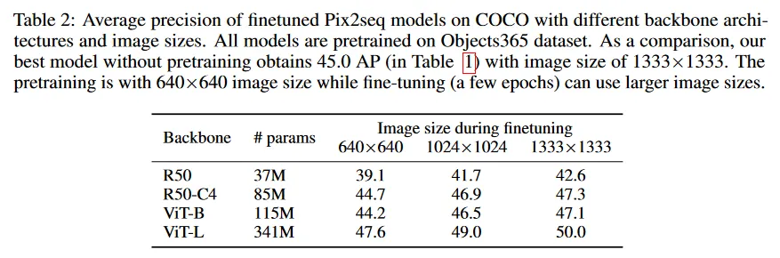 Table 2에서 보이는대로 Object365 pre-trained Pix2Seq 모델은 댜앙한 모델 크기와 이미지 크기에 걸쳐 강력하다. 최고 성능(1333 이미지 크기)는 50 AP이고, 이것은 처음부터 학습된 모델보다 5% 더 좋고, 640 이미지 크기에서도 성능은 매우 잘 유지된다. 주목할만한 것은 pre-training에 더 작은 이미지 크기를 사용할 때, pre-train+fine-tuning 절차가 처음부터 학습한 것보다 더 빠르고 일반화도 더 낫다는 것이다. 이 두 factor는 더 크고 더 뛰어난 모델을 학습하는데 핵심이다.