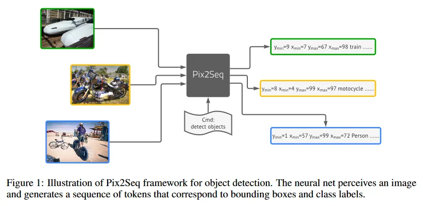우리는 object detection을 위한 간단하고 일반적인 프레임워크인 Pix2Seq를 제안한다. task에 관한 prior 지식을 명시적으로 통합하는 기존 접근과 달리 우리는 object detection을 관찰된 픽셀 입력을 조건으로 한 언어 모델링 task로 object detection을 변환한다. object description(예: bounding box와 class label)은 이산 토큰의 시퀀스로 표현되고, 우리는 신경망을 학습하여 이미지를 인식하고 원하는 시퀀스를 생성한다. 우리의 접근은 주로 신경망이 object가 어디에 있고 무엇인지를 안다면 단지 단지 그것들을 어떻게 읽어내는지를 가르치면 된다는 직관에 기반을 둔다. task-specific data augmentation을 사용하는 것 외에는 task에 관한 최소한의 가정만 사용하며, 매우 특화되고 매우 잘 최적화된 detection 알고리즘과 비교하여 도전적인 COCO 데이터셋에서 경쟁력 있는 결과를 달성한다.