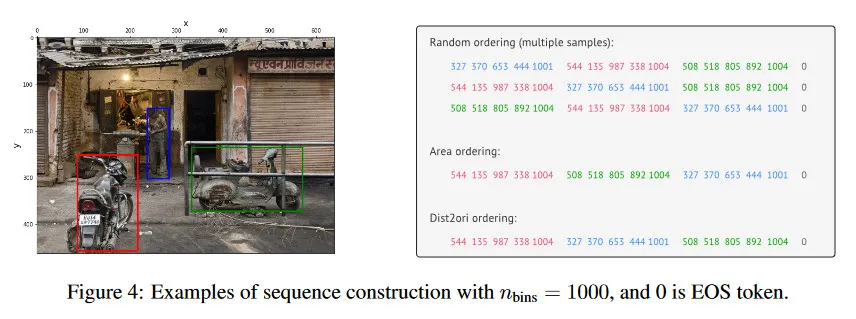 마지막으로 다양한 이미지에 있는 object의 수가 다르기 때문에, 생성된 시퀀스도 다른 길이를 갖는다. 시퀀스의 끝을 가리키기 위해 우리는 EOS 토큰을 통합한다. 다양한 ordering 전략을 사용하는 시퀀스 생성 절차는 그림 4에 나타난다.