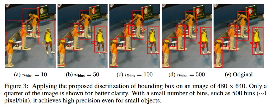클래스 라벨은 자연스럽게 이산 토큰으로 표현되는 반면, bounding box는 그렇지 않다. bounding box는 두 corner point(즉, top-left와 bottom-right) 또는 center point와 height, width에 의해 결정된다. 우리는 corner point의 좌표(다른 format에서는 height, width)로 사용되는 연속적인 수를 이산화하는 방법을 제안한다. 구체적으로 object는 5개 이산 토큰의 시퀀스로 나타난다. 즉 , 여기서 각 연속 코너 좌표는 사이의 정수로 균등하게 이산화되고 는 클래스 index이다. 우리는 모든 토큰에 대해 공유된 vocabulary를 사용하고 따라서 vocabulary 크기는 ‘bins 수 + class 수’와 같다. 이 bounding box 양자화 방식은 작은 vocabulary로도 높은 정밀도를 달성할 수 있도록 한다. 예컨대 600x600 이미지는 단지 600 bins만으로 zero 양자화 에러를 달성한다. 이것은 32K 또는 그 이상의 vocabulary 크기를 갖는 현대의 언어 모델링 보다 훨씬 작다. bonding box의 위치에 대한 다양한 양자화 레벨의 효과는 그림 3에 설명된다.