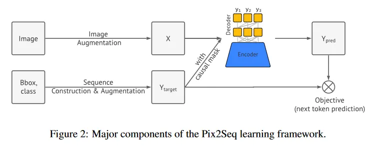 제안 된 Pix2Seq 프레임워크에서 우리는 object detection을 픽셀 입력을 조건화 된 언어 모델링 작업으로 변환한다(그림 1). 시스템은 4가지 주요 컴포넌트로 구성된다(그림 2).