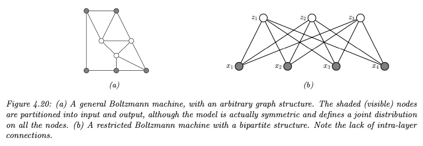 이에 대한 대안으로 잠재 변수를 추가한 것이 바로 Boltmann Machine이다. 여기서 그래프 구조는 임의적일 수 있으나 격자는 허용되지 않는다. 아래 그림 참조. 색상이 있는 점이 visible 변수이고, 흰색이 latent 변수이다.