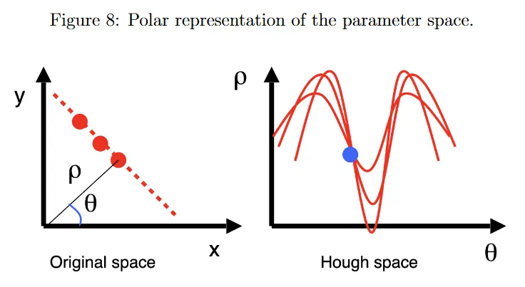 그림 8의 왼쪽 절반에서 가 원점에서 선까지의 최소 거리(이미지 크기 또는 데이터셋에서 임의의 두 점 사이의 최대 거리로 bound 됨)이고, 는 x축과 선의 normal vector 사이의 각도(0과 사이로 bound 됨)이다. 이전과 동일한 Hough voting 절차를 사용하지만 Cartesian space에서 특정한 를 지나는 모든 가능한 선은 이제 통해 Hough space에서 sinusoidal profile에 해당한다. 그림 8의 오른쪽 절반 참조.