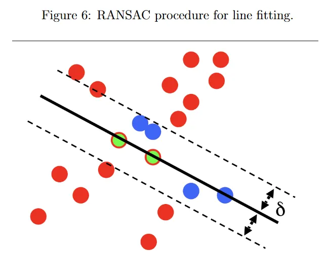 다시 개의 2d 점 집합 이 있고 여기에 line을 맞추기를 원한다고 하자. 그림 6 참조. RANSAC의 첫 번째 단계는 모델을 fit하는데 필요한 최소 수의 점을 랜덤으로 선택하는 것이다. 선에는 최소 2개 점이 필요하므로 녹색점 2개를 선택한다. 만일 fundamental 행렬 를 추정하면 eight-point algorithm을 사용하기 위해 8개의 대응점을 선택해야 한다. 만일 homography 을 계산하려면 scale까지 8개의 자유도를 다루기 위해 4개 대응점(각 대응점에 좌표 2개)이 필요하다. RANSAC에서 두 번째 단계는 랜덤 샘플 집합에 모델을 맞추는 것이다. 여기서 녹색점 2개에 선이 fit 되어(즉, 두 점 사이에 선이 그려진다) 검은색 선을 얻는다. 세 번째 단계는 fit 된 모델을 사용하여 전체 데이터셋에서 inlier set을 계산하는 것이다. 모델 파라미터 가 주어지면 inlier 집합을 로 정의한다. 여기서 은 데이터 포인트와 모델 사이의 residual이고 는 임의의 threshold이다. 여기서 inlier set은 녹색과 파란색 점으로 표현된다. inlier set의 크기 는 전체 점 집합 중 fit된 모델과 일치하는 정도를 표시한다. 를 사용하면 를 정의하여 outlier set을 얻을 수도 있다. 여기서 outlier set은 빨간색 점으로 표시된다. 우리는 inlier set의 크기가 최대화될 때까지 유한한 반복 횟수 동안 이 단계를 새로운 새로운 랜덤 샘플로 반복한다. RANSAC이 다양한 fitting 시나리오에 대해 간단하고 구현하기 쉽지만, 샘플 횟수 과 tolerance(허용) threshold 와 같은 몇 가지 파라미터를 조정해야 한다. RANSAC은 또한 좋은 모델에 동의하는 충분한 수의 inlier가 있다고 가정하며 파라미터를 계산하는 횟수에 대한 상한선이 없다(계산적으로 실현 가능하지 않은 경우 제외)