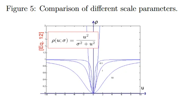 residual 가 클 때 비용 는 1로 saturate(포화)되어 비용에 대한 그들의 기여가 제한되지만, 가 작을 때는 비용함수는 squared error를 유사하다. 그러나 이제 scale parameter라 부르는 를 선택해야 한다. 는 잠재적 outlier에 가중치를 얼마나 부여할지를 제어한다. 그림 5 참조. 큰 는 중심의 2차 커브를 넓혀서, 다른 포인트에 대해 outlier에 상대적으로 더 페널티 부여한다(원래의 제곱 에러 함수와 유사하게). 작은 는 2차 커브를 좁혀, outlier에 대한 페널티 덜 부여한다. 가 너무 작으면 실제로 그렇지 않더라도 대부분의 residual가 outlier로 취급되어 빈곤한 fit을 이끈다. 가 너무 크면 견고한 비용 함수에서 이점을 얻지 못하고 결국 least-squares fit이 된다.