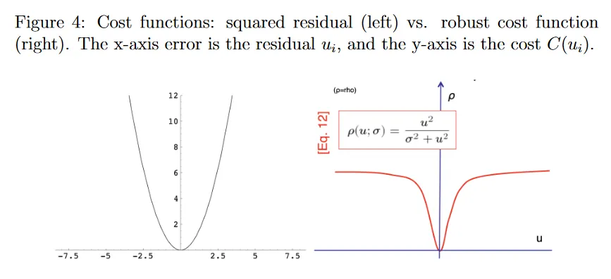 다음과 같은 견고한 비용함수(그림 4의 오른쪽 절반)를 사용하여 큰 residuals(outliers)에 페널티를 부여할 수 있다.