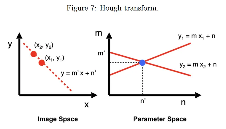 다시 형식의 선을 이미지에서 점의 시리즈 에 fit하기를 원한다고 하자. 그림 7의 왼쪽 절반 참조. 이 선을 찾기 위해 그림 7의 오른쪽 절반에 나온 dual parameter 또는 Hough space를 고려한다. 이미지 공간의 점 (선 상에 있음)는 으로 정의되는 파라미터 공간의 선이 된다. 유사하게 파라미터 공간에서 점 은 이미지 공간에서 으로 주어지는 선이 된다.