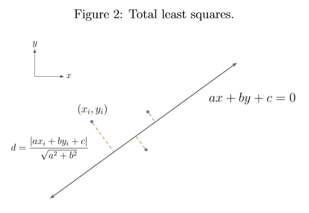 여기서 . 그러면 선의 기울기는 이다. 이것은 이제 정의되지 않을 수 있다. 이전에는 residual가 y축에만 있었지만 이제 새로운 선 파라미터화가 x와 y축 모두의 error를 고려하므로, 새로운 error는 squared orthogonal distance의 합이된다. 그림 2 참조.
