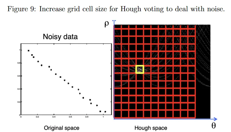 실제로 noisy 데이터 점은 이미지 공간에서 동일한 선 상의 점들에 해당하는 Hough space의 sinusoidal profile이 Hough space에서 반드시 동일한 점에서 교차하지 않을 수 있다. 이것을 해결하기 위해 그림 9에 나온 것처럼 grid cell의 width 를 증가시켜서 imperfect(불완전한) 교차점에 대한 tolerance(허용 오차)를 증가시킬 수 있다. 이렇게 하면 noisy 데이터를 다루는데 도움이 되지만 조정해야 하는 또 다른 파라미터가 생긴다. 작은 grid 크기는 noise 때문에 이미지 공간의 선을 놓칠 수 있는 반면, 큰 grid 크기는 모든 내의 셀이 가능한 선이기 때문에 다른 선을 병합하고 추정 정확도를 낮출 수 있다.