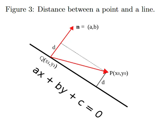 2d 데이터 포인트 와 선의 점 가 주어지면, 에서 선까지의 거리는 를 선에 수직인 normal vector(법선) 에 projection한 길이와 같다. 와 라 하면 다음과 같이 된다.