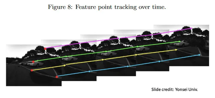 Feature Tracking은 이미지 시퀀스에 대해 모든 이미지에 걸쳐 2d 점의 집합의 위치를 추적하는 것을 말한다. 아래 그림 참조. 이것은 depth 추정과 유사하게 이미지 시퀀스 전체에 걸쳐 대응 문제를 해결하는 것으로 볼 수 있다.