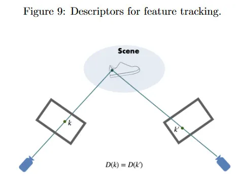 아래 그림에서 는 픽셀 의 -차원 표현을 제공한다(종종 이웃 정보를 통합함). 가 동일한 3d 점에 해당하므로, 이들이 시각적으로 유사할 것이라고 기대하며, 따라서 서로 다른 viewpoint에서 포착되었더라도 그들의 descriptor는 동일해야 한다. 즉, 이어야 한다. 그 다음 descriptor 사이의 유사성에 기반하여 서로 다른 프레임의 픽셀을 매칭할 수 있다.