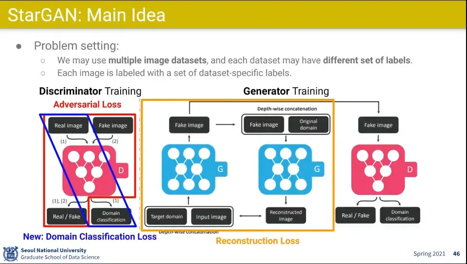Reconstruction Loss는 CycleGAN과 비슷한데, 원래 도메인으로 변환하는게 아니라 어느 도메인으로도 변환할 수 있음.