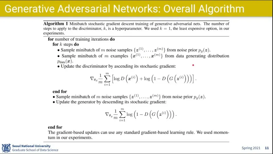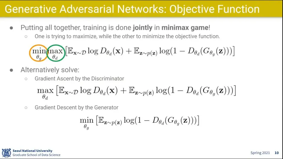 Generator의 식은 Discriminator의 오른쪽 수식과 같은 식이고, 같은 식을 두고 Discriminator는 최대화하려고 하고, Generator는 최소화 하려고 함