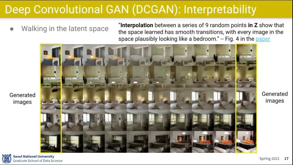 생성된 이미지들 사이에 interpolation을 시켰더니 실제로 서서히 바뀌는 모습이 나옴