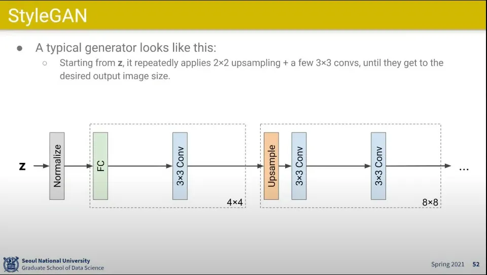 일반적인 Generator는 Z로부터 시작해서 Conv Layer를 통과하고 Upsampling 하면서 이미지 크기를 키워 감