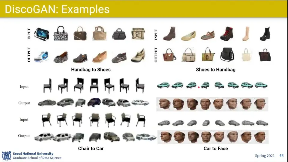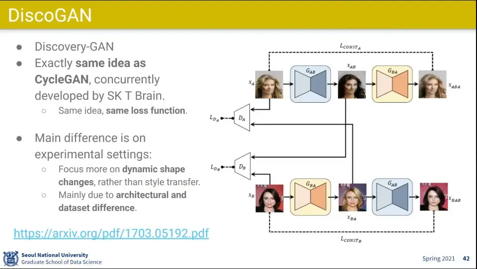 CycleGAN이랑 비슷한 아이디어로 나온게 DiscoGAN. SK T Brain에서 만듦